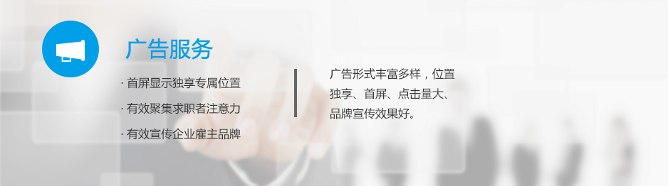 廣告服務基于龐大的網(wǎng)絡平臺,位于首屏,企業(yè)客戶可以在首頁擁有專享位置,被推薦的職位和公司始終占據(jù)求職者的第一視線,極大地聚焦求職者的注意力,從而大幅度提升招聘職位的關(guān)注度、點擊量及招聘效果。廣告有知名企業(yè)招聘、熱點招聘、品牌招聘、搜索置頂、海報等多種類型。企業(yè)客戶可根據(jù)招聘需求選擇合適的廣告類型,完成招聘需求。